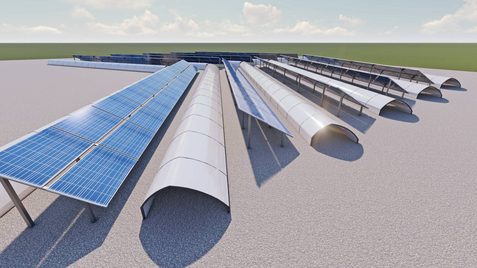 Actively – the reflector is calculated and invented with a certain area and slope with an oval curve like an arc, which aims to direct the sun’s rays in the specific surface – the photovoltaic modules. The larger front arc of the reflector is designed to reflect the solar irradiation all day long to the back side of the module’s row. The smaller back arc of the reflector is designed to reflect the sunlight directly to the front part of the modules placed on the back side row. The reflector arc surface on both sides is calculated and designed with the same size of the module surface in front and at the back side, so it covers fully the solar active surface. With the reflecting arc constructed in this way, the sunlight is spreading in a cone shape.